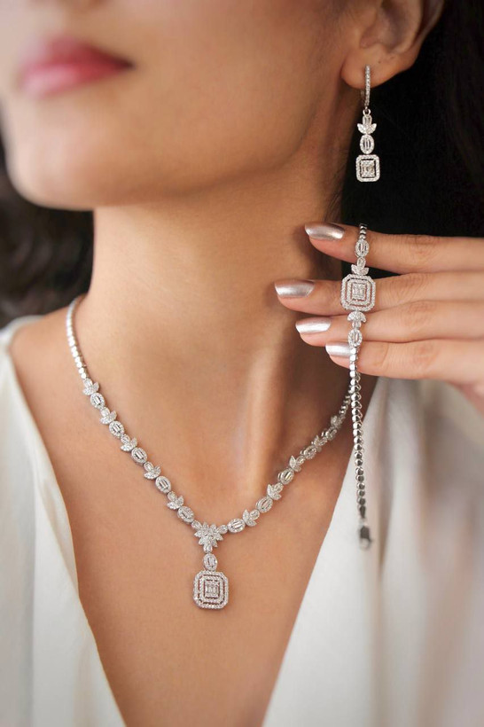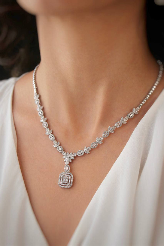سرویس نقره زنانه طرح خاص با نگینهای درخشان، انتخابی لوکس برای مجالس و مهمانیها. این سرویس شامل گردنبند، گوشواره و دستبند با طراحی ظریف و الهامگرفته از جواهرات الماس است. جنس نقره عیار ۹۲۵ با روکش رودیوم باعث درخشش و ماندگاری بالا میشود. مناسب برای عروس، جشنها و هدیهای خاص برای مناسبتهای ویژه.