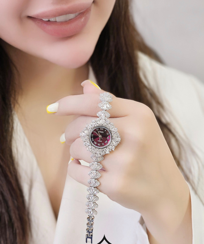 ساعت نقره جواهری زنانه از ساعت های شیک و جذاب ساخته شده از نقره با عیار 925 می باشد.سنگ های به کار رفته در آن امرالد و برلیان از جنس اتمی زیرکونیا می باشند که به صورت میکروستینگ مخراج کاری شده اند و در برابر ضربه مقاوم اند.جنس بدنه از نقره به عیار 925 بوده و تنها قسمتی از محصول که نقره نیست موتور آن می باشد.آبکاری دو مرحله ای رودیوم(طلا سفید)، سبب کیفیت بی نظیر دوام رنگ آن شده است و به دلیل عدم استفاده از نیکل در ساختار آن،بدون حساسیت بوده و با پوست حساس سازگار است.وزن تقریبی ساعت +- 33.50 گرم می باشد.