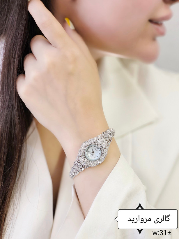 ساعت نقره جواهری زنانه از ساعت های شیک و جذاب ساخته شده از نقره با عیار 925 می باشد.سنگ های به کار رفته در آن امرالد و برلیان از جنس اتمی زیرکونیا می باشند که به صورت میکروستینگ مخراج کاری شده اند و در برابر ضربه مقاوم اند.جنس بدنه از نقره به عیار 925 بوده و تنها قسمتی از محصول که نقره نیست موتور آن می باشد.آبکاری دو مرحله ای رودیوم(طلا سفید)، سبب کیفیت بی نظیر دوام رنگ آن شده است و به دلیل عدم استفاده از نیکل در ساختار آن،بدون حساسیت بوده و با پوست حساس سازگار است.وزن تقریبی ساعت +- ۳۱ گرم می باشد.