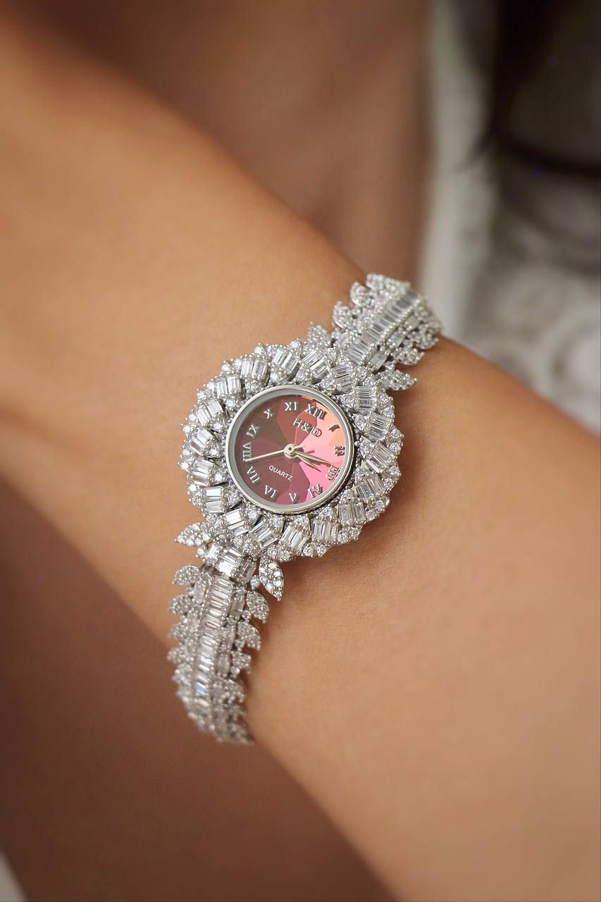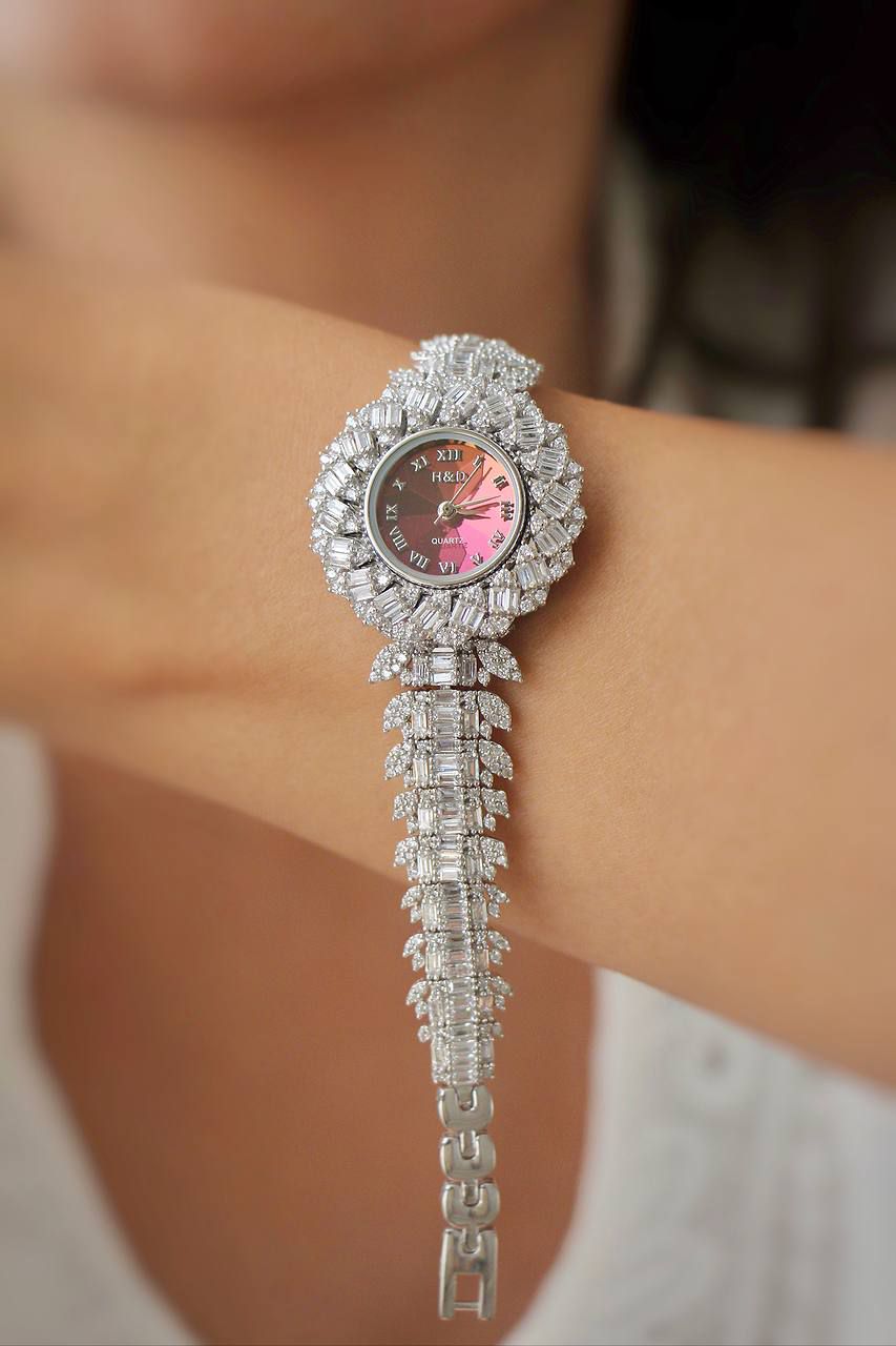 ساعت نقره جواهری زنانه از ساعت های شیک و جذاب ساخته شده از نقره با عیار 925 می باشد.سنگ های به کار رفته در آن امرالد و برلیان از جنس اتمی زیرکونیا می باشند که به صورت میکروستینگ مخراج کاری شده اند و در برابر ضربه مقاوم اند.جنس بدنه از نقره به عیار 925 بوده و تنها قسمتی از محصول که نقره نیست موتور آن می باشد.آبکاری دو مرحله ای رودیوم(طلا سفید)، سبب کیفیت بی نظیر دوام رنگ آن شده است و به دلیل عدم استفاده از نیکل در ساختار آن،بدون حساسیت بوده و با پوست حساس سازگار است.وزن تقریبی ساعت +-۳۵.۲ گرم می باشد.