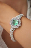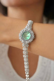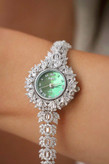 ساعت نقره جواهری زنانه از ساعت های شیک و جذاب ساخته شده از نقره با عیار 925 می باشد.سنگ های به کار رفته در آن امرالد و برلیان از جنس اتمی زیرکونیا می باشند که به صورت میکروستینگ مخراج کاری شده اند و در برابر ضربه مقاوم اند.جنس بدنه از نقره به عیار 925 بوده و تنها قسمتی از محصول که نقره نیست موتور آن می باشد.آبکاری دو مرحله ای رودیوم(طلا سفید)، سبب کیفیت بی نظیر دوام رنگ آن شده است و به دلیل عدم استفاده از نیکل در ساختار آن،بدون حساسیت بوده و با پوست حساس سازگار است.وزن تقریبی ساعت +- ۳۲ گرم می باشد.